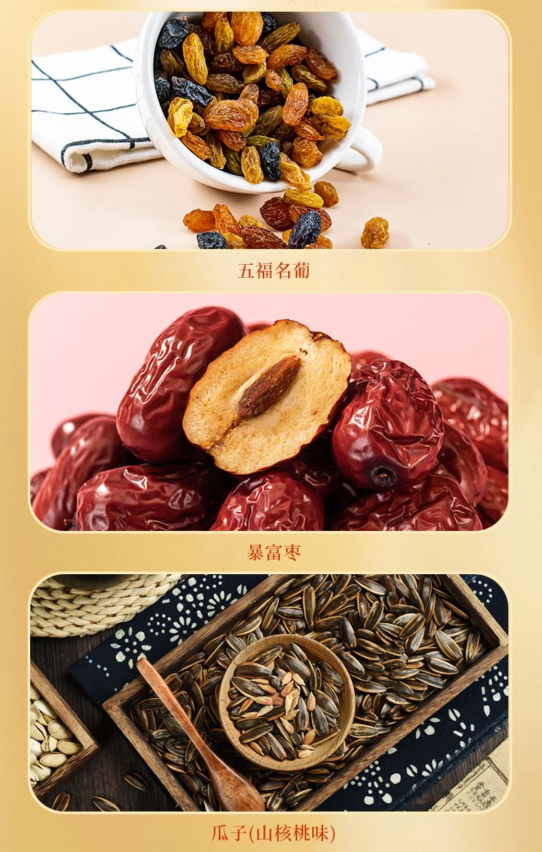 臻心之禮,贈(zèng)予珍貴之人。中國(guó)紅與蒂芙尼藍(lán)交織,點(diǎn)亮新春儀式感。禮盒之上,城市地標(biāo)巍然屹立,映著萬(wàn)家燈火,與承載吉祥寓意的堅(jiān)果,共筑此刻團(tuán)圓年味。一份滿載心意的佳禮,敬歲月悠悠,敬情誼綿長(zhǎng)。 禮盒配置: 105克悅品開(kāi)心果 *1袋 105克珍品夏威夷果 *1袋 105克尚品紫衣腰果 *1袋 105克壹品笑口巴旦木 *1袋 108克優(yōu)品笑口杏仁 *1袋 238克金光桂圓干 *1袋 280克五福名葡 *1袋 380克暴富棗 *1袋 105克上品瓜子(山核桃味) *1袋