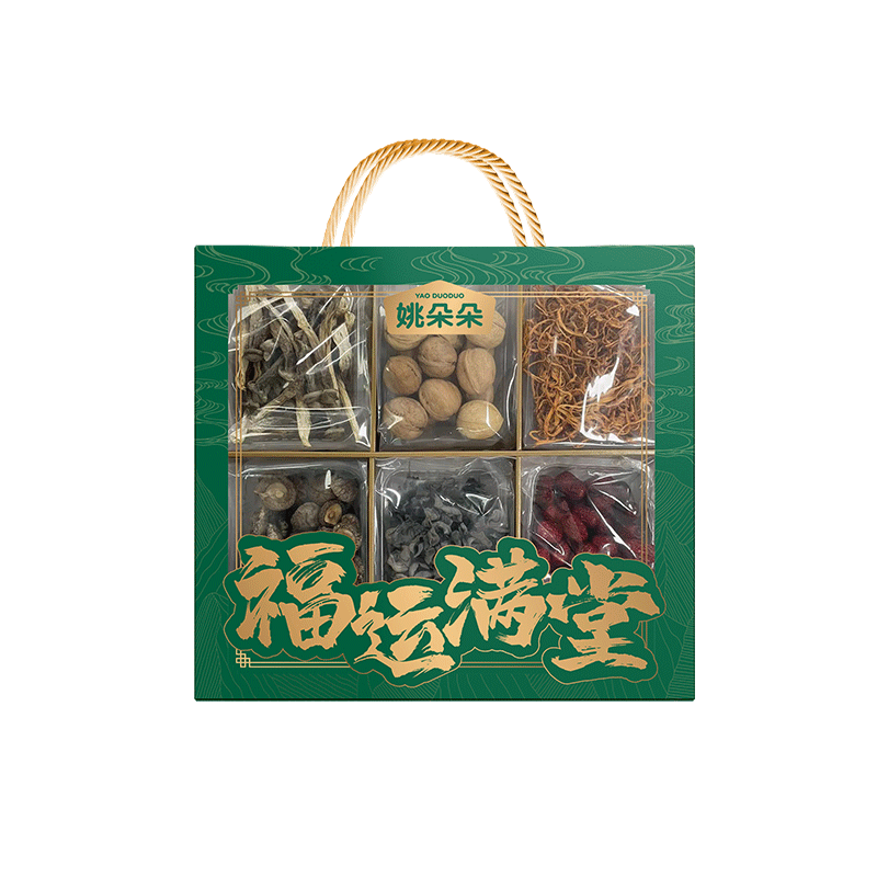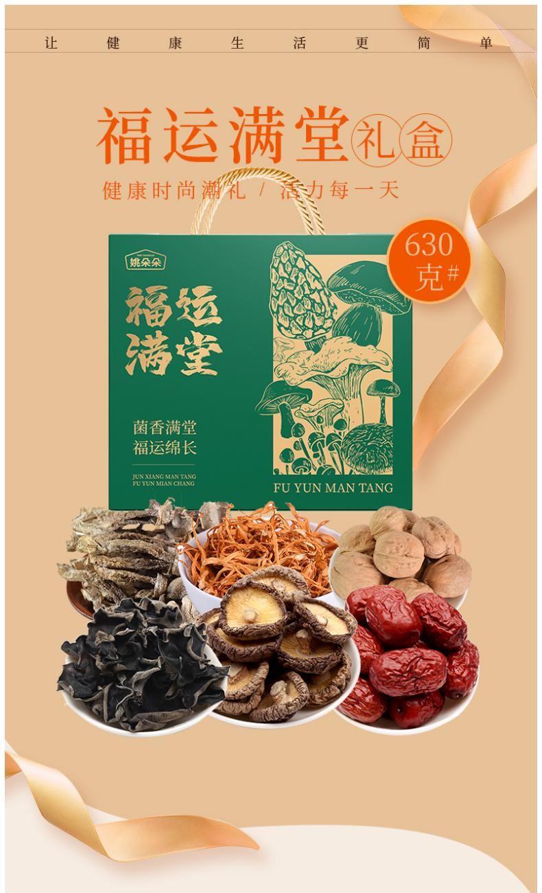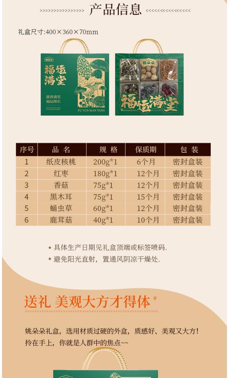 姚朵朵核桃200克 姚朵朵紅棗180克 姚朵朵香菇75克 姚朵朵黑木耳75克 姚朵朵蛹蟲草60克 姚朵朵鹿茸菌40克 福運滿堂禮盒