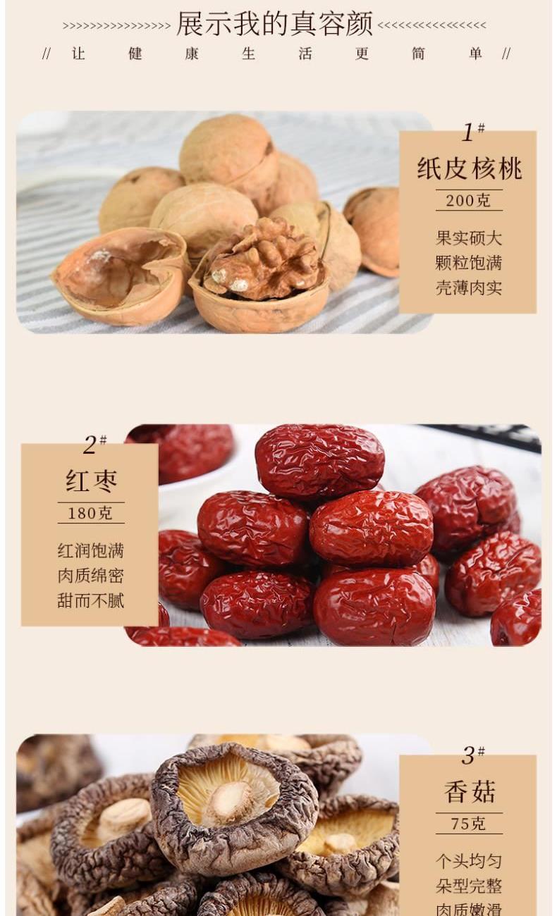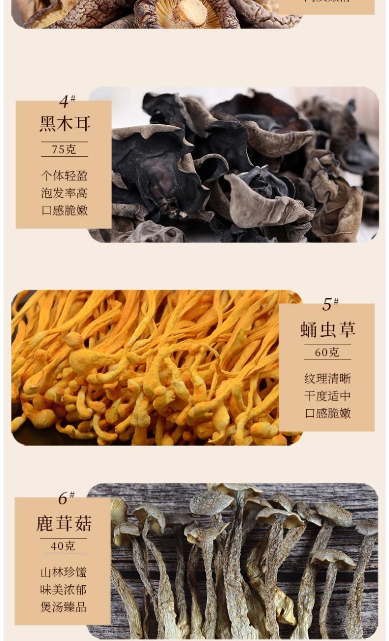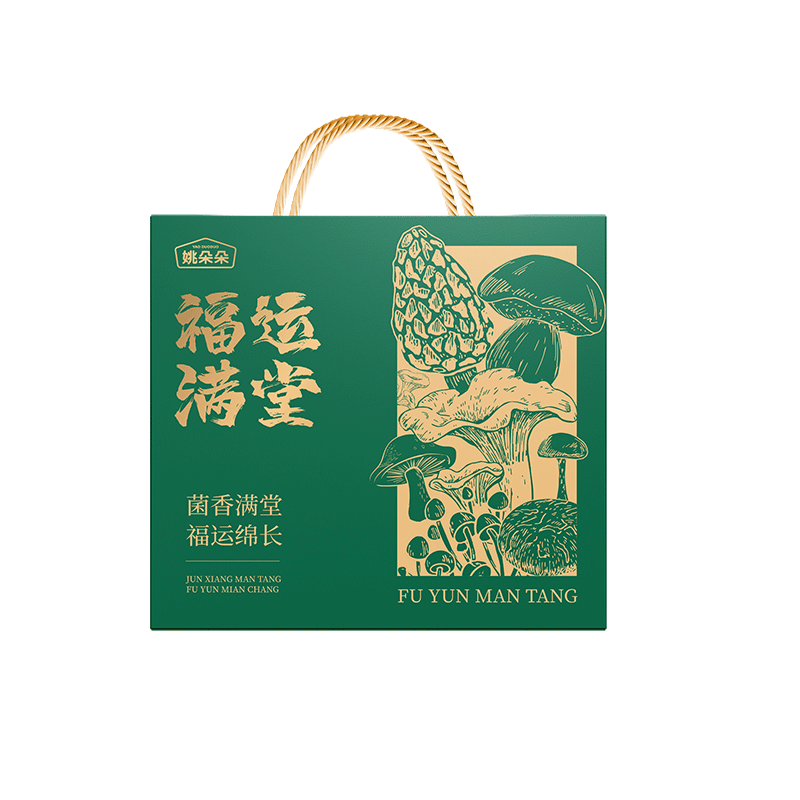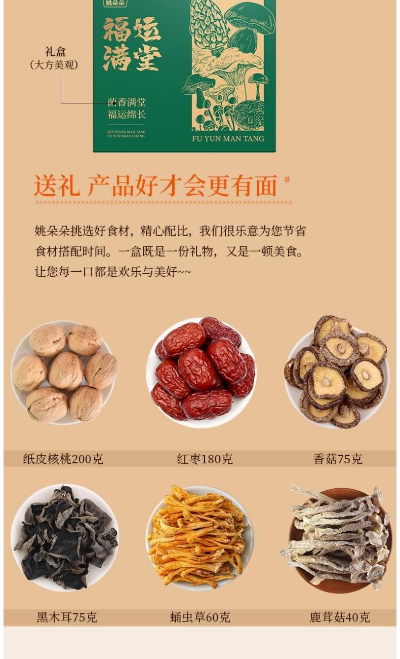姚朵朵核桃200克 姚朵朵紅棗180克 姚朵朵香菇75克 姚朵朵黑木耳75克 姚朵朵蛹蟲草60克 姚朵朵鹿茸菌40克 福運滿堂禮盒