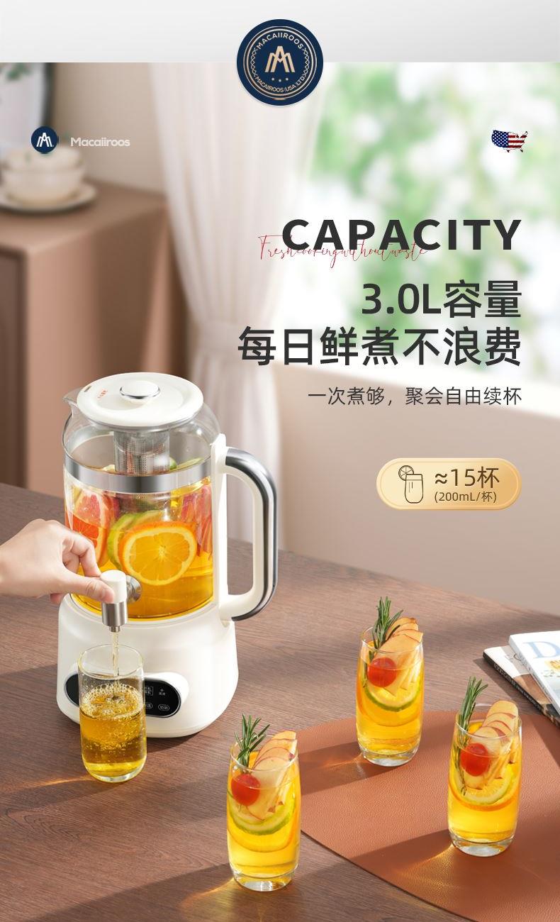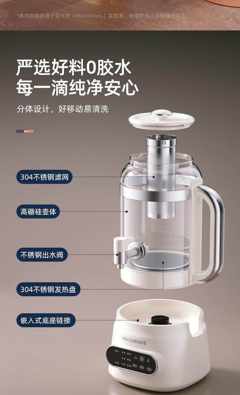 材質(zhì)優(yōu)勢(shì)304不銹鋼發(fā)熱盤,高硼硅壺體,不銹鋼出水龍頭;