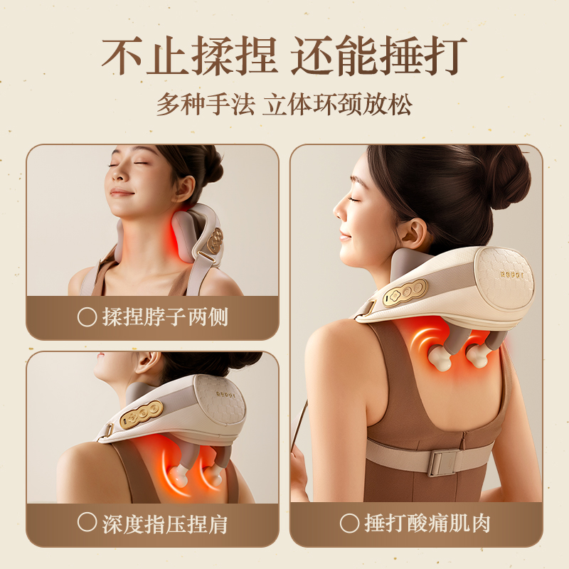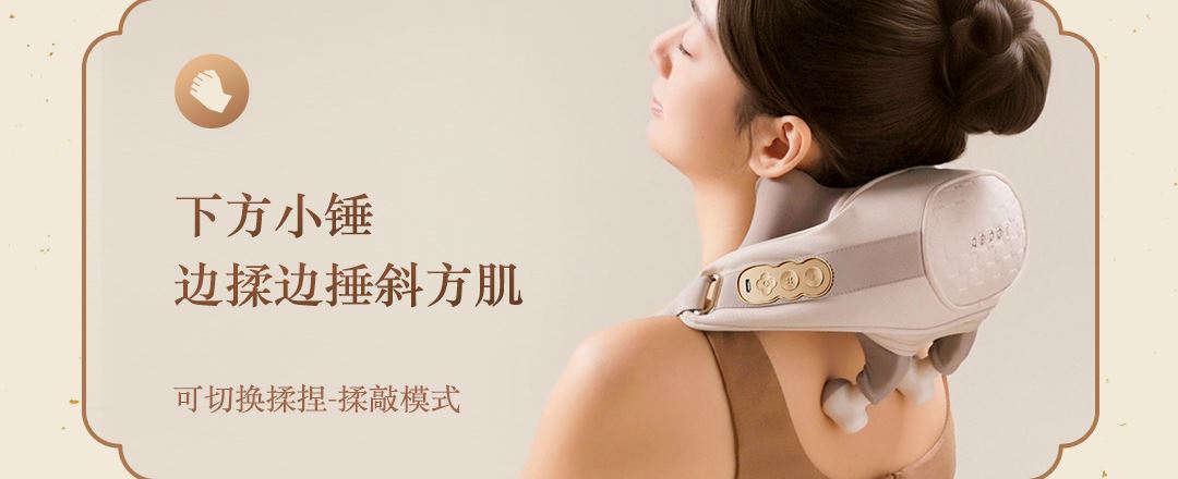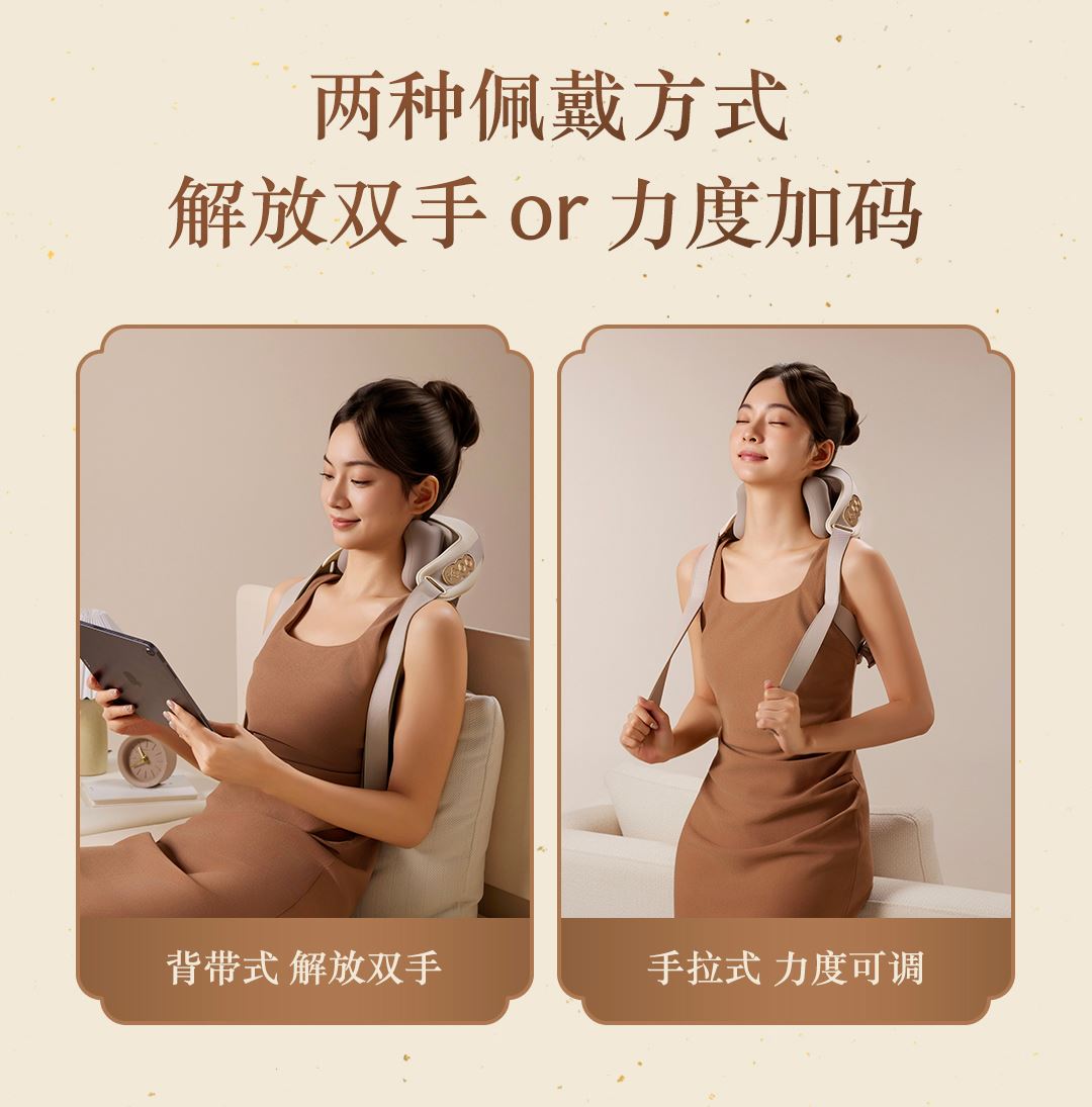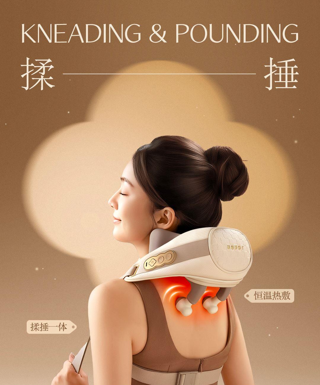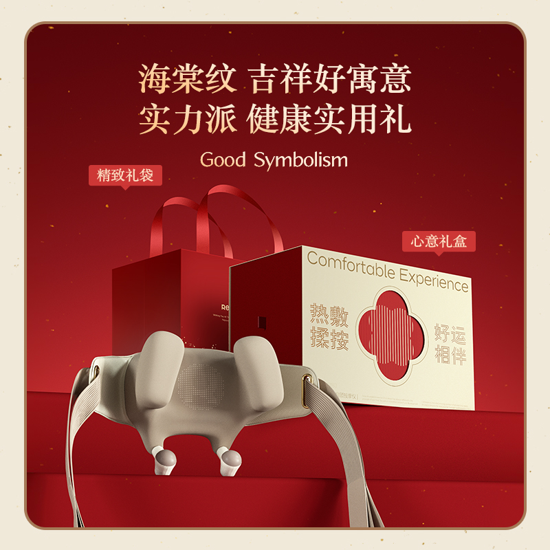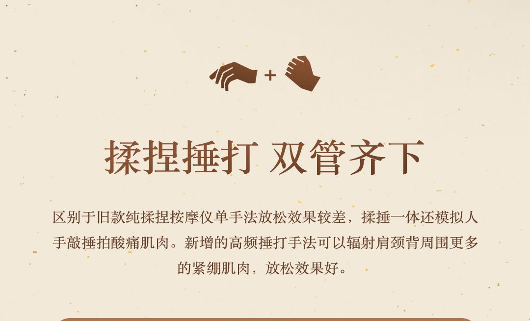 揉捏+捶打 雙手法結(jié)合,按摩面積大 熱敷緩解緊張,力度可調(diào) 搭配可拆洗布套 搭配精致燙金禮盒 送禮更合適