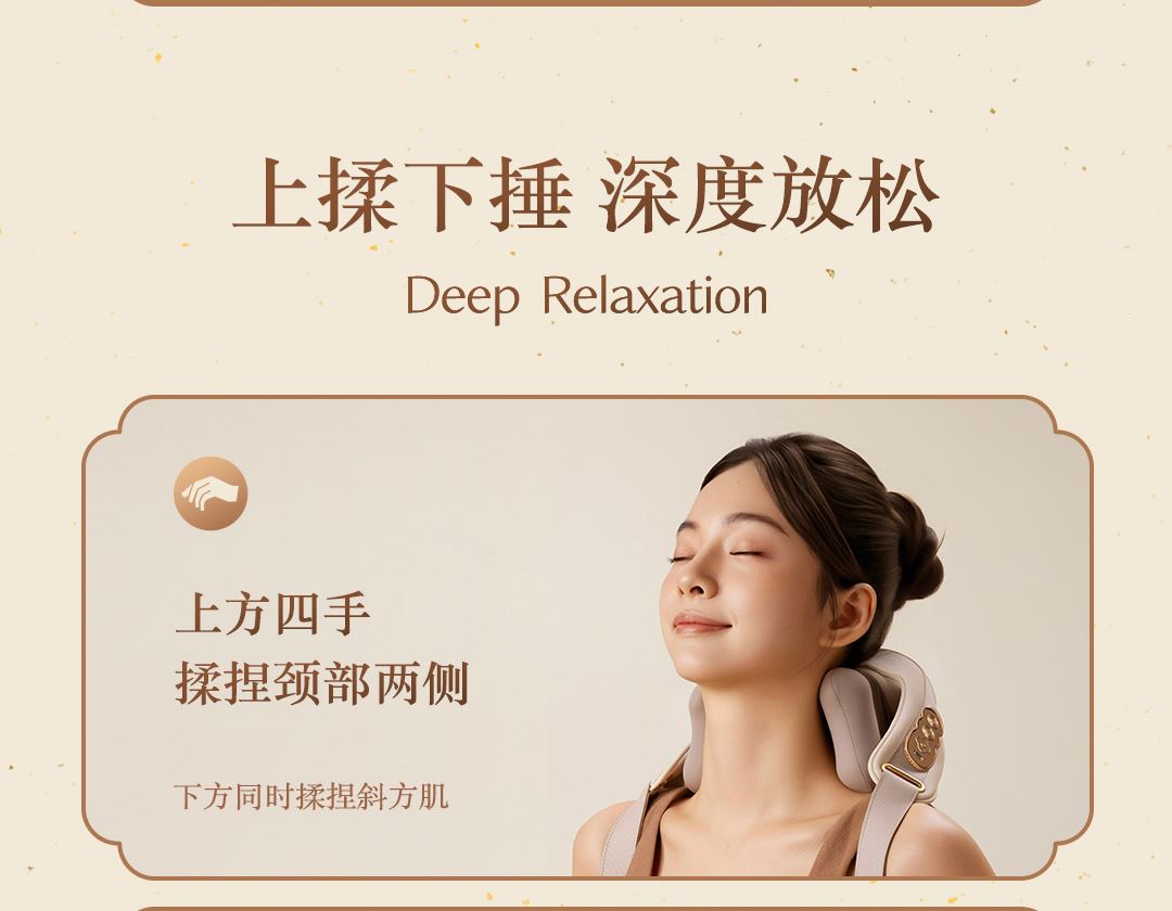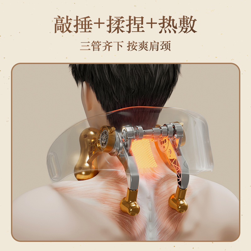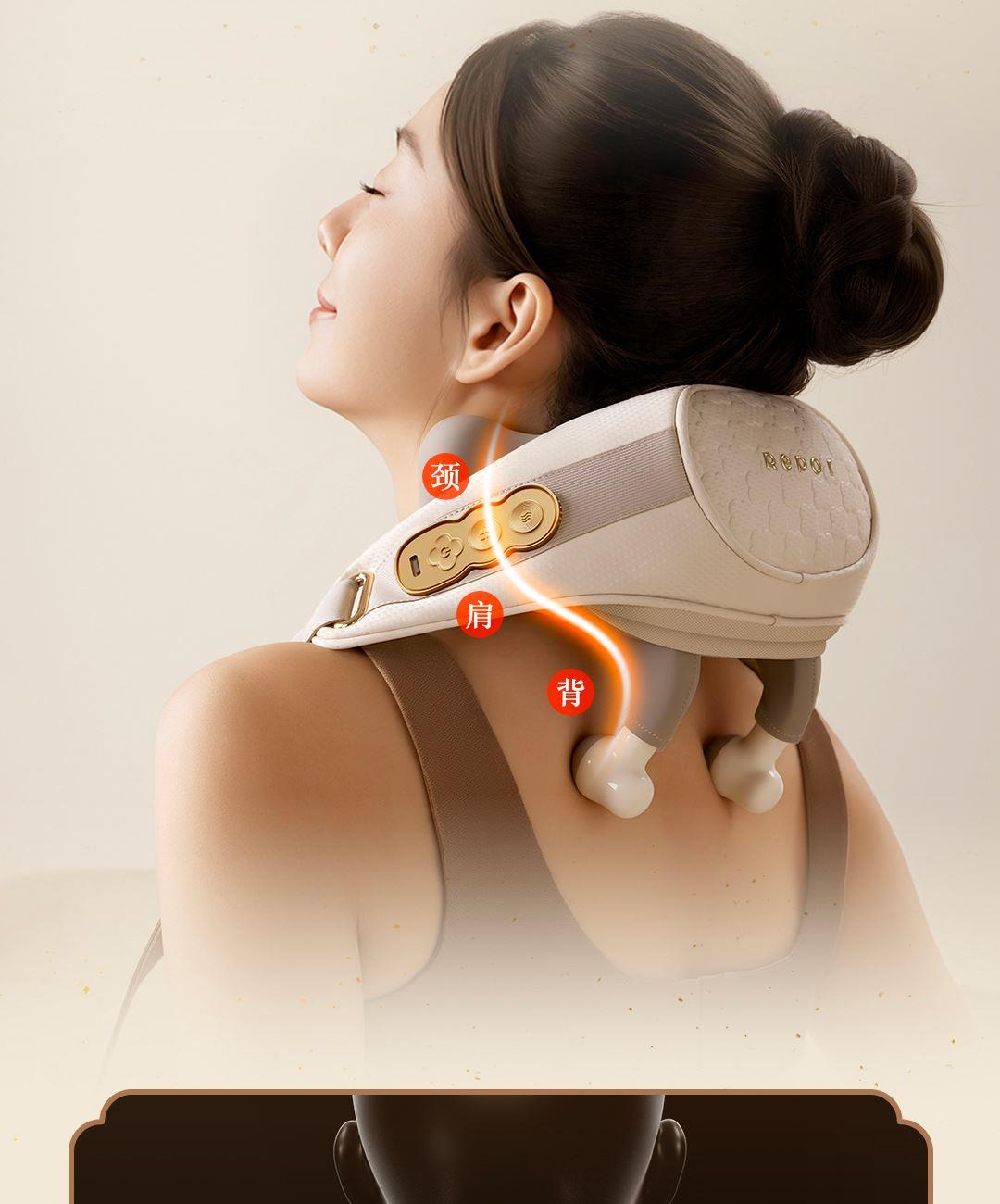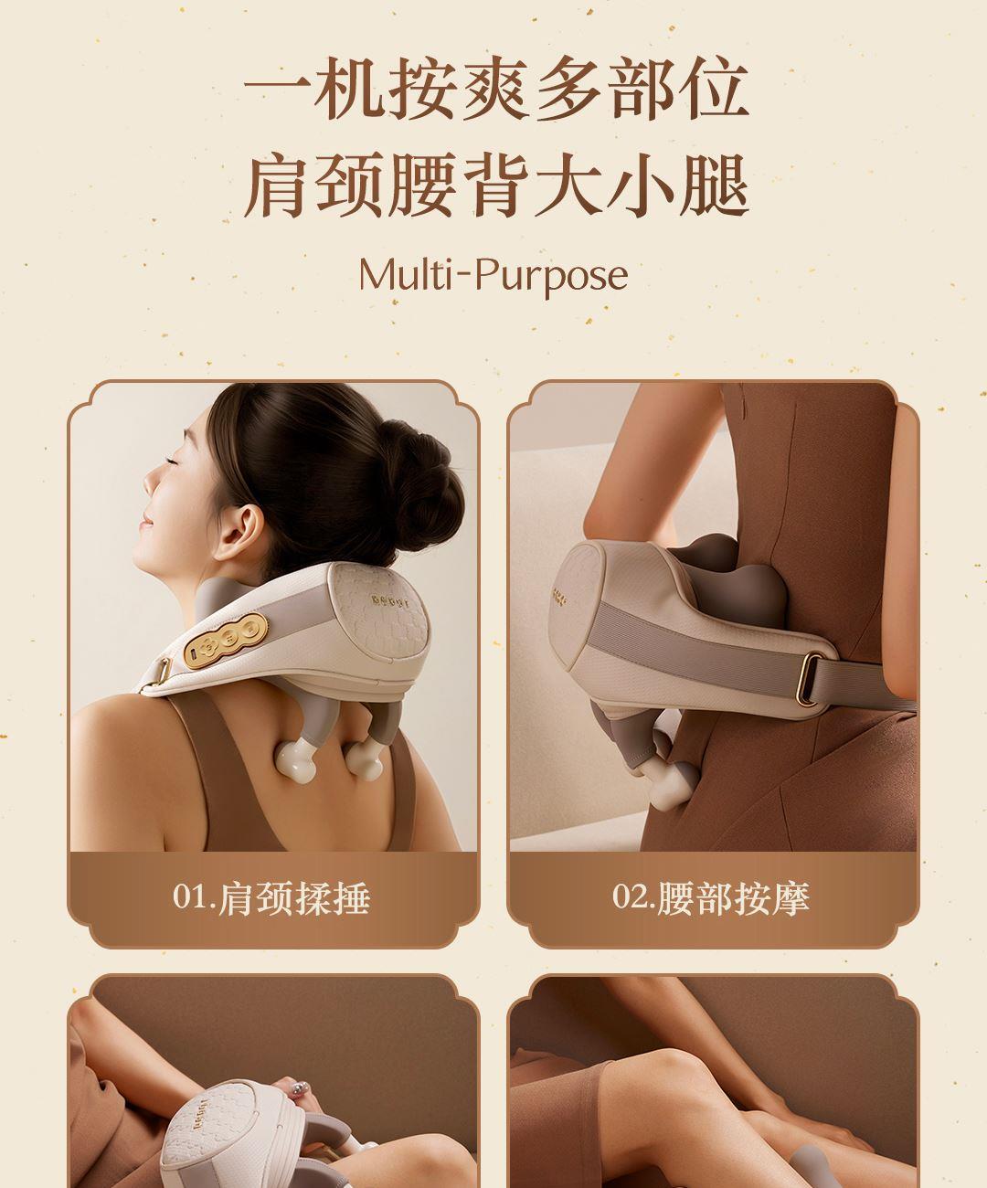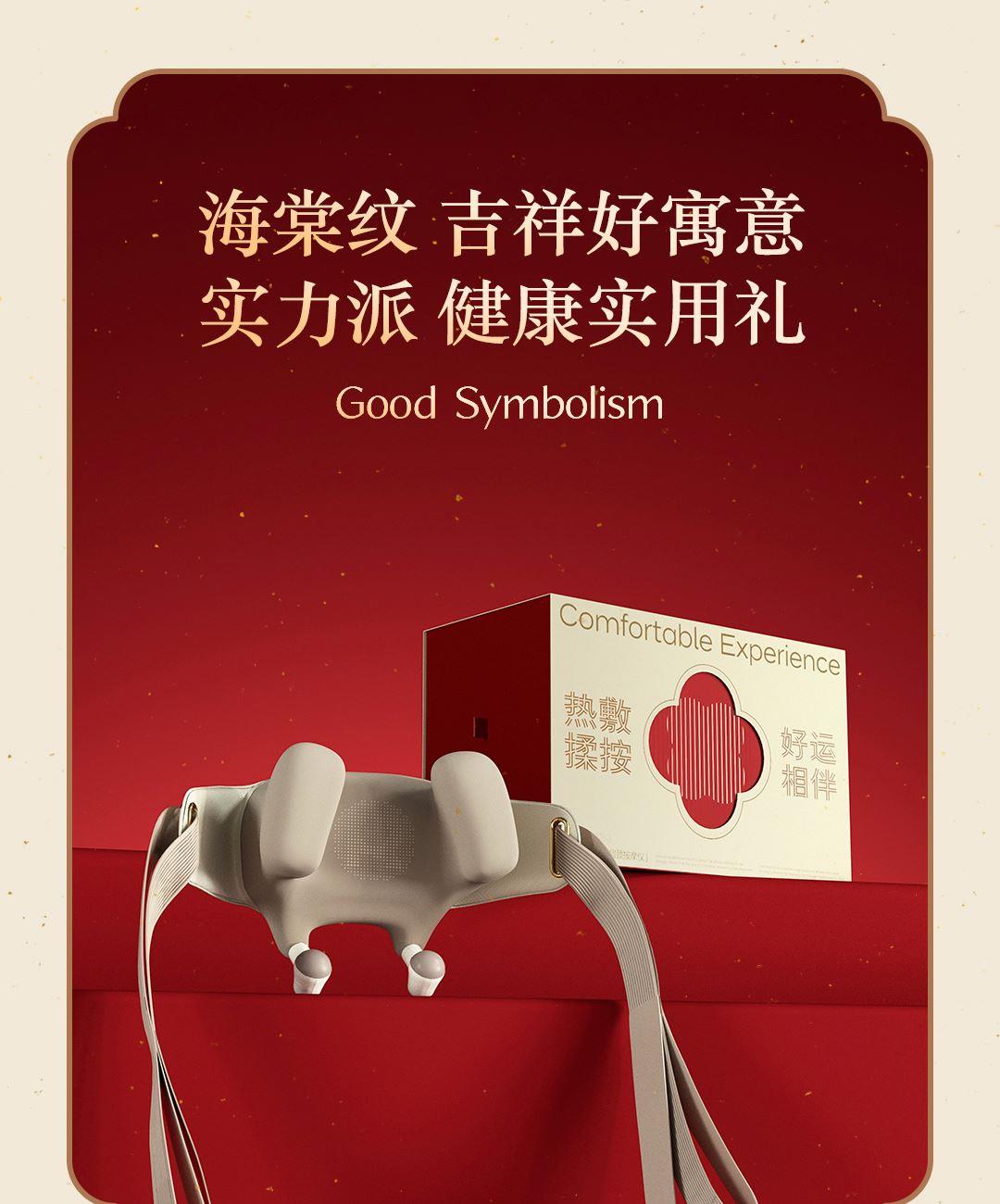 揉捏+捶打 雙手法結(jié)合,按摩面積大 熱敷緩解緊張,力度可調(diào) 搭配可拆洗布套 搭配精致燙金禮盒 送禮更合適