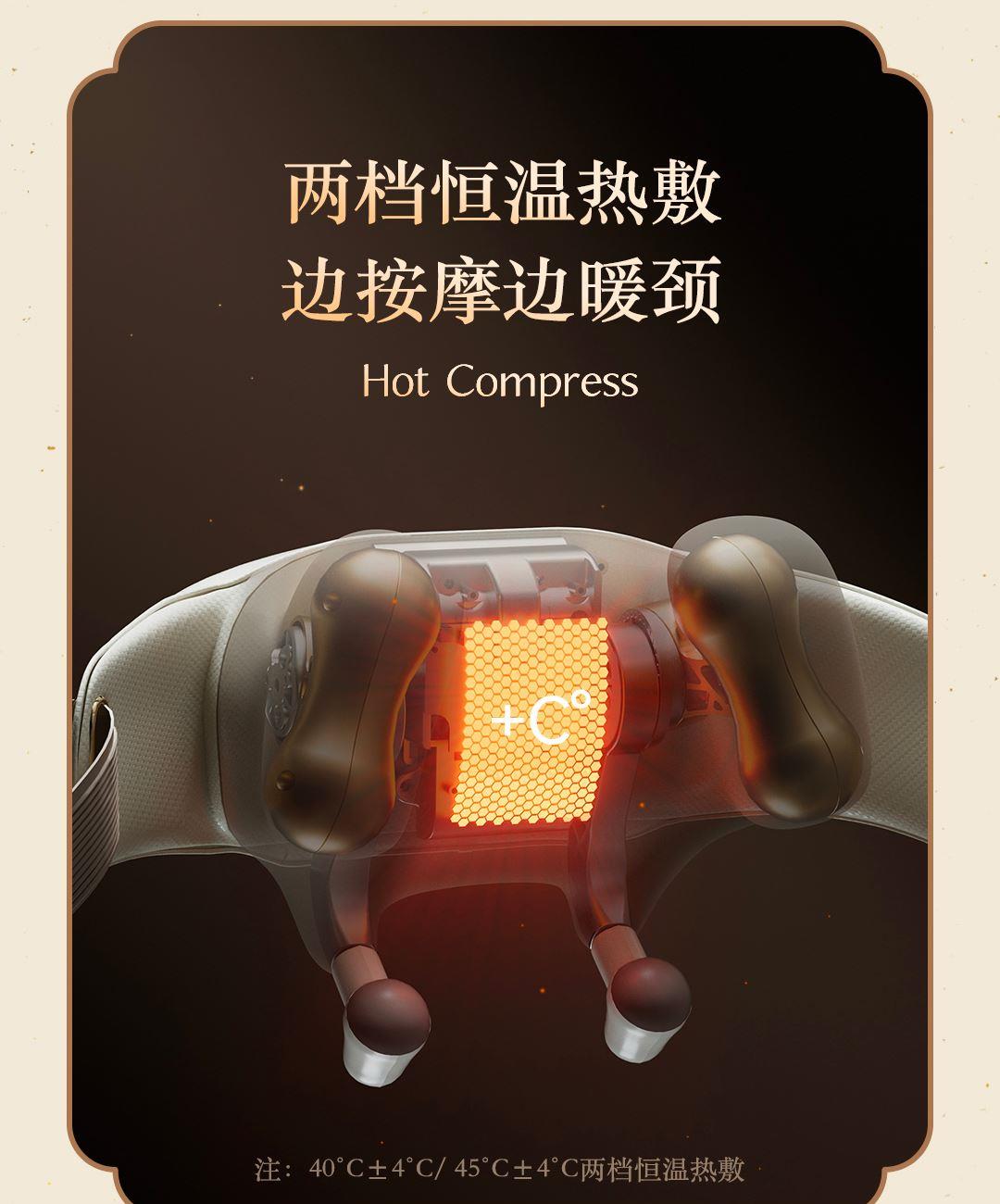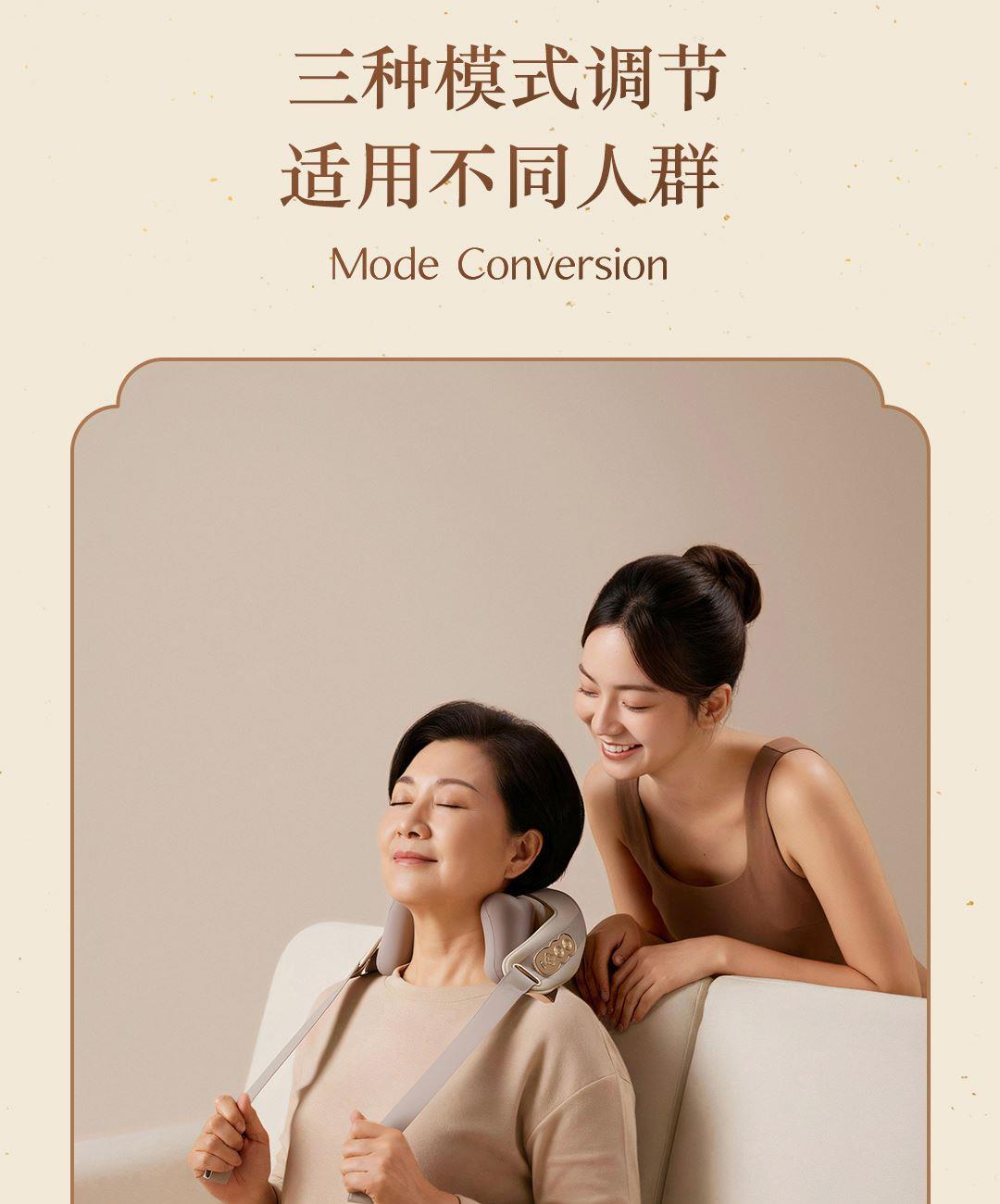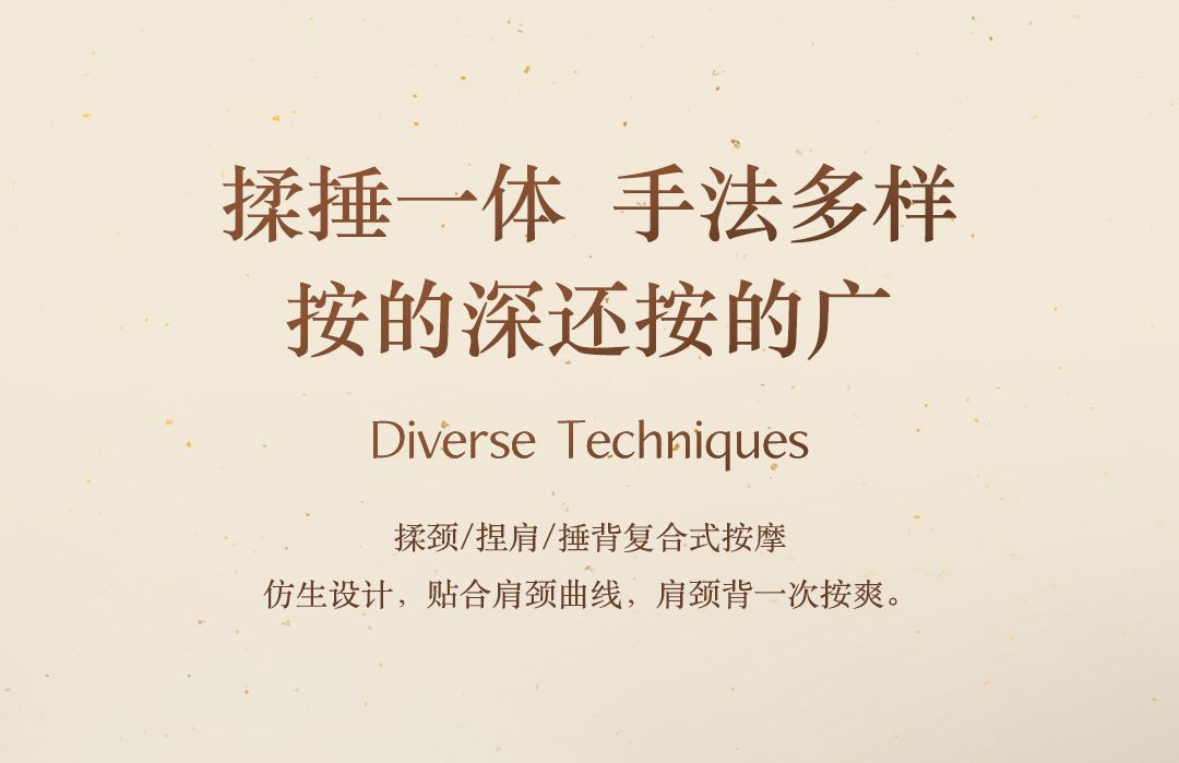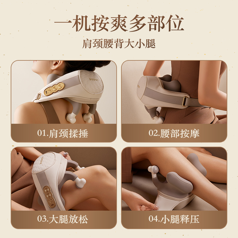 揉捏+捶打 雙手法結(jié)合,按摩面積大 熱敷緩解緊張,力度可調(diào) 搭配可拆洗布套 搭配精致燙金禮盒 送禮更合適