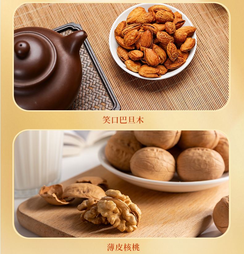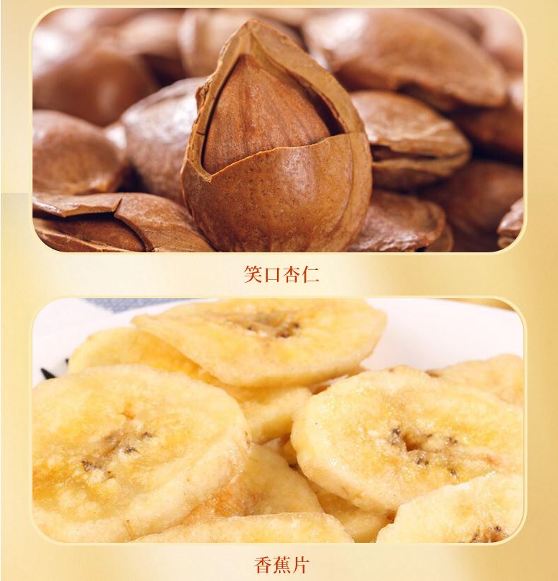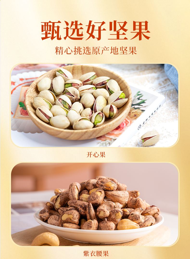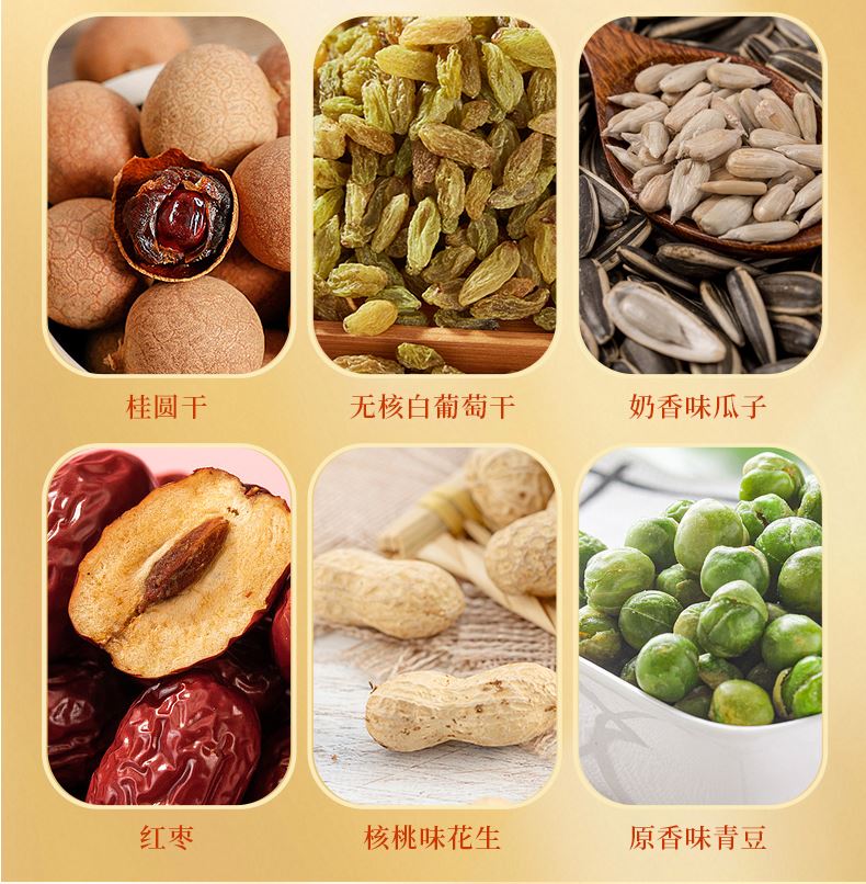 禮盒配置: 60克開(kāi)心果 *1袋 60克紫衣腰果 *1袋 70克笑口巴旦木 *1袋 88克薄皮核桃 *1袋 76克笑口杏仁 *1袋 88克香蕉片 *1袋 68克桂圓干 *1袋 108克無(wú)核白葡萄干 *1袋 88克紅棗 *1袋 88克奶香味瓜子 *1袋 88克核桃味花生 *1袋 88克原香味青豆 *2袋