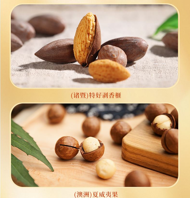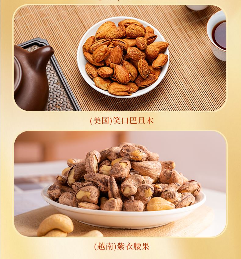 以禧禮,敬豐年。禮盒甄選正紅與克萊因藍,碰撞出獨特視覺張力;豐收版畫躍然其上,為佳節(jié)注入傳統(tǒng)儀式感。盒內(nèi)臻選八款品質(zhì)堅果,滿載豐盛心意,獻上觸手可及的圓滿祝福,愿鴻禧常伴,歲歲皆豐年。 禮盒配置: 158克臨安原香味山核桃仁/方形罐*1 258克臨安椒鹽味手剝山核桃/方形罐*1 228克諸暨特好剝香榧/方形罐*1 160克南非碧根果/方形罐*1 160克加州本色開心果/方形罐*1 160克澳洲夏威夷果/方形罐*1 150克加州NP笑口巴旦木/方形罐*1 200克越南紫衣腰果/方形罐*1