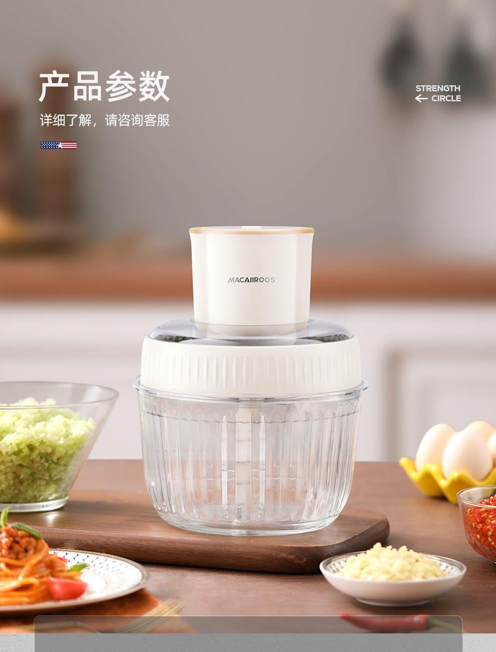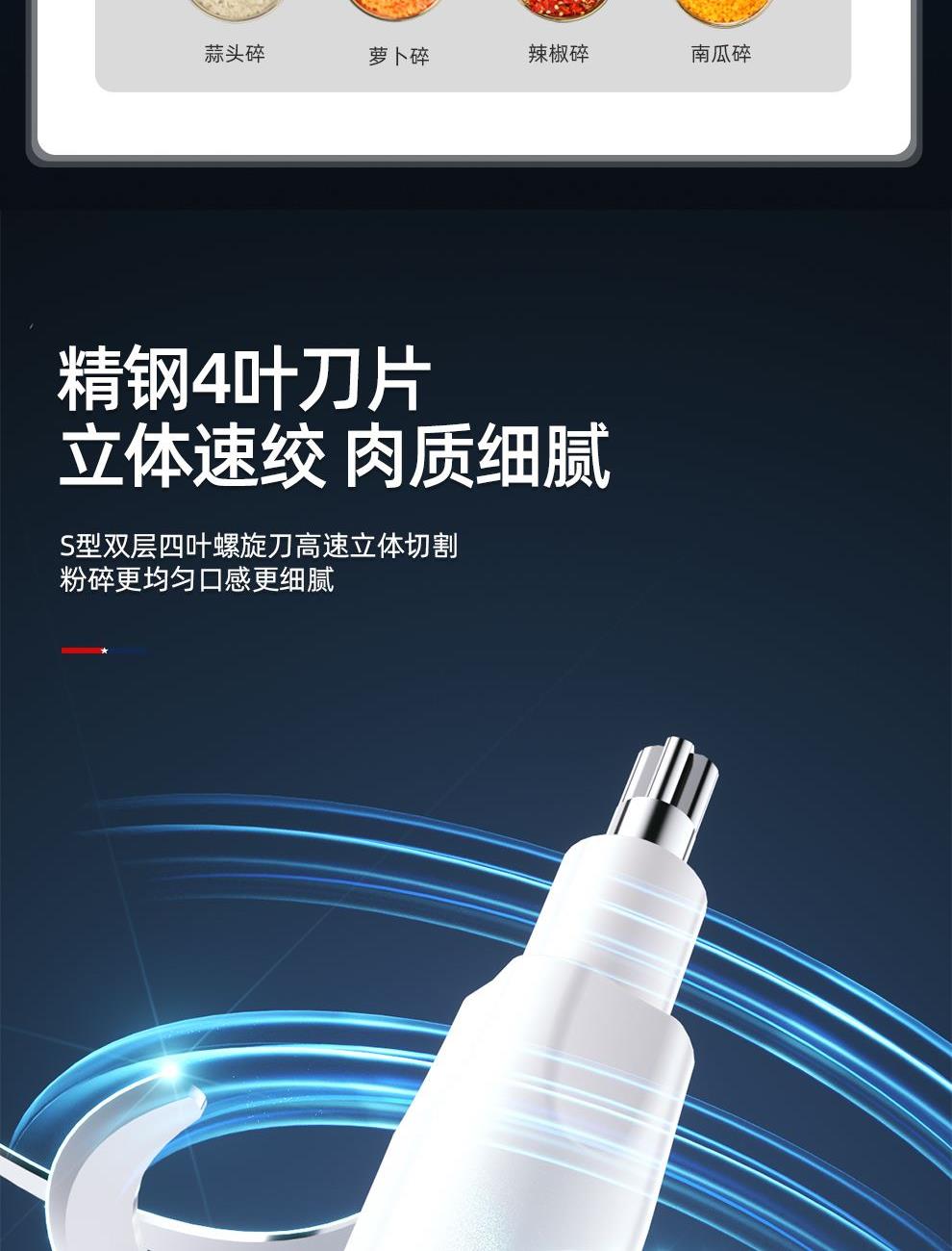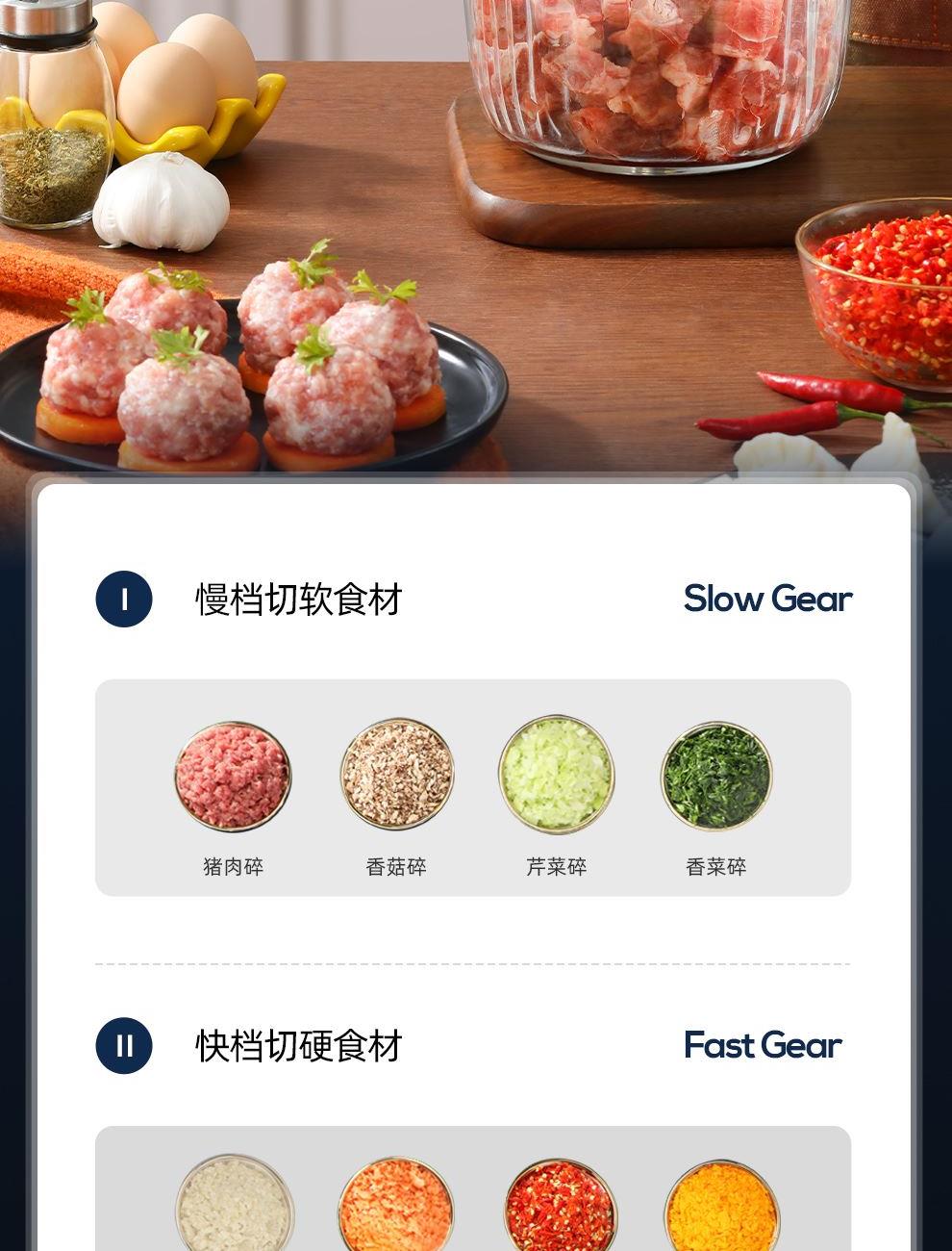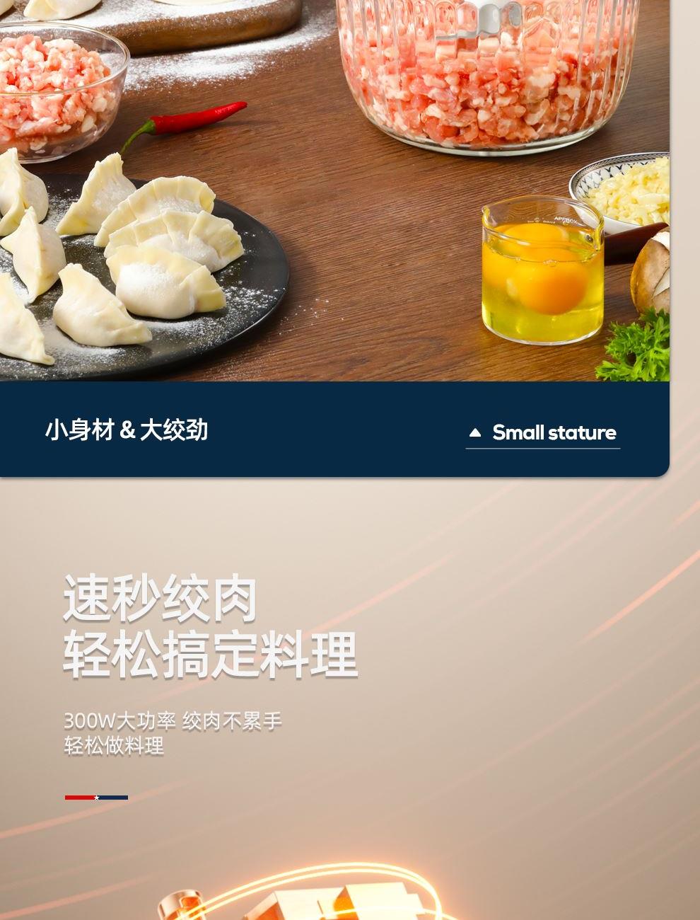 額定功率:300W 額定容量:2.0L 額定電壓:220V~ 額定頻率:50Hz 產(chǎn)品凈重:1.9kg 產(chǎn)品毛重:2.1kg 整箱重量:20.3kg 一機(jī)多用高硼硅玻璃攪拌杯,透明可視上蓋,絞肉、絞菜粗細(xì)易控; 快慢兩檔切換點(diǎn)動(dòng)控制,切碎隨意控制,抬手即停; 高速電機(jī)300W大功率高速電機(jī),細(xì)膩攪拌,秒速肉餡; 不銹鋼刀頭&安全無憂S型雙層、四葉精鋼分離式刀頭;