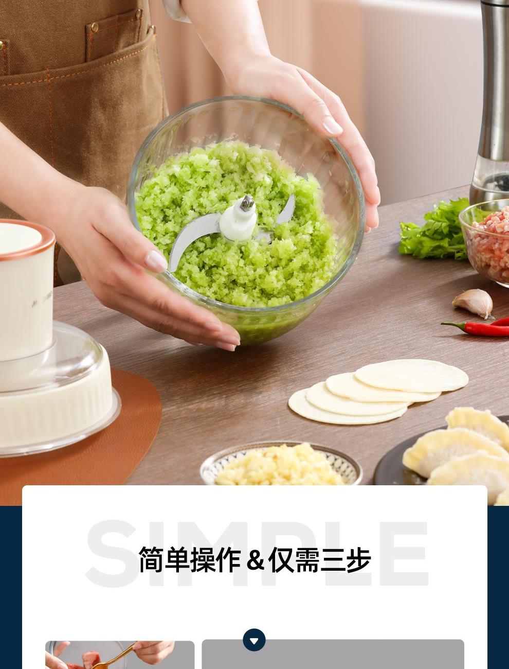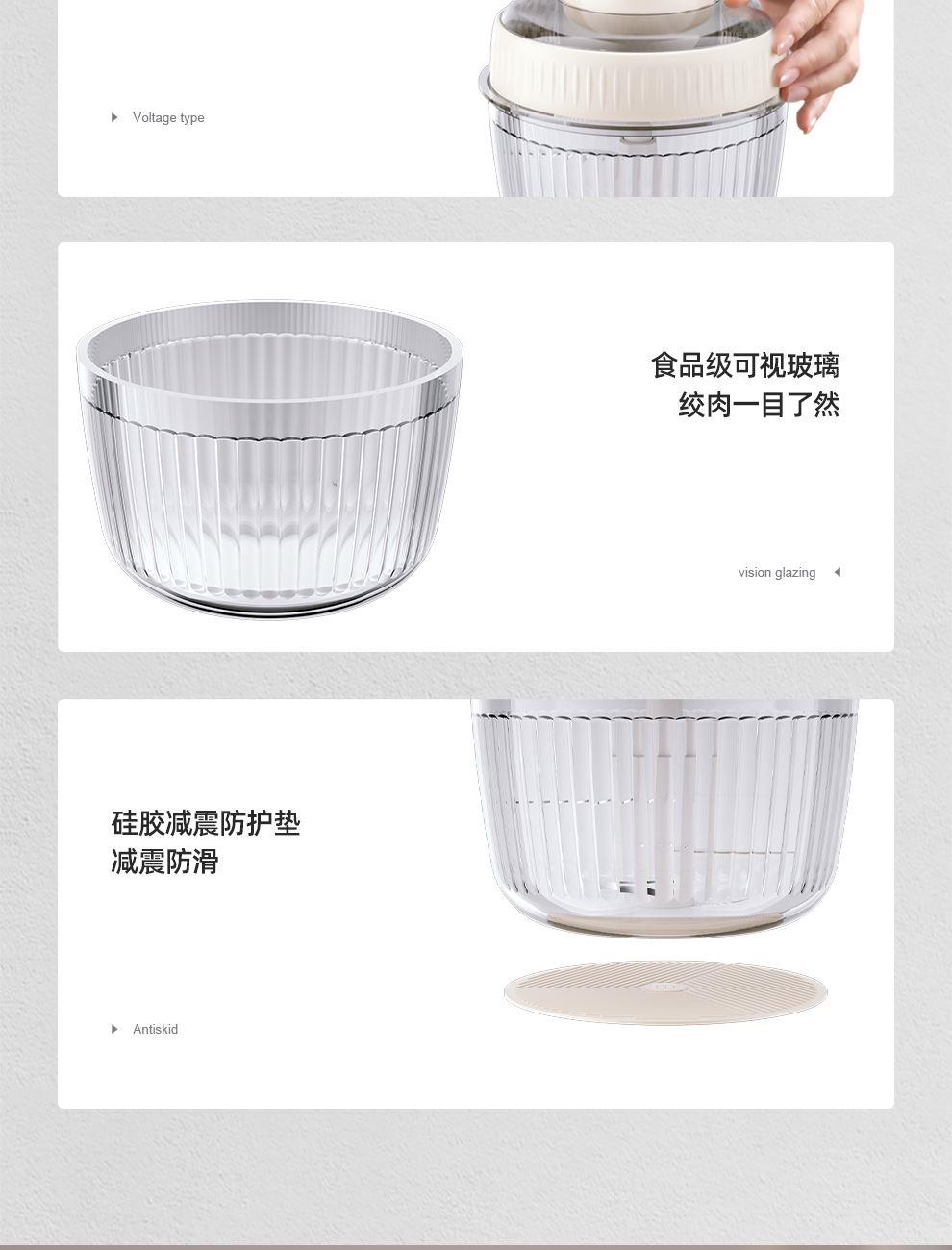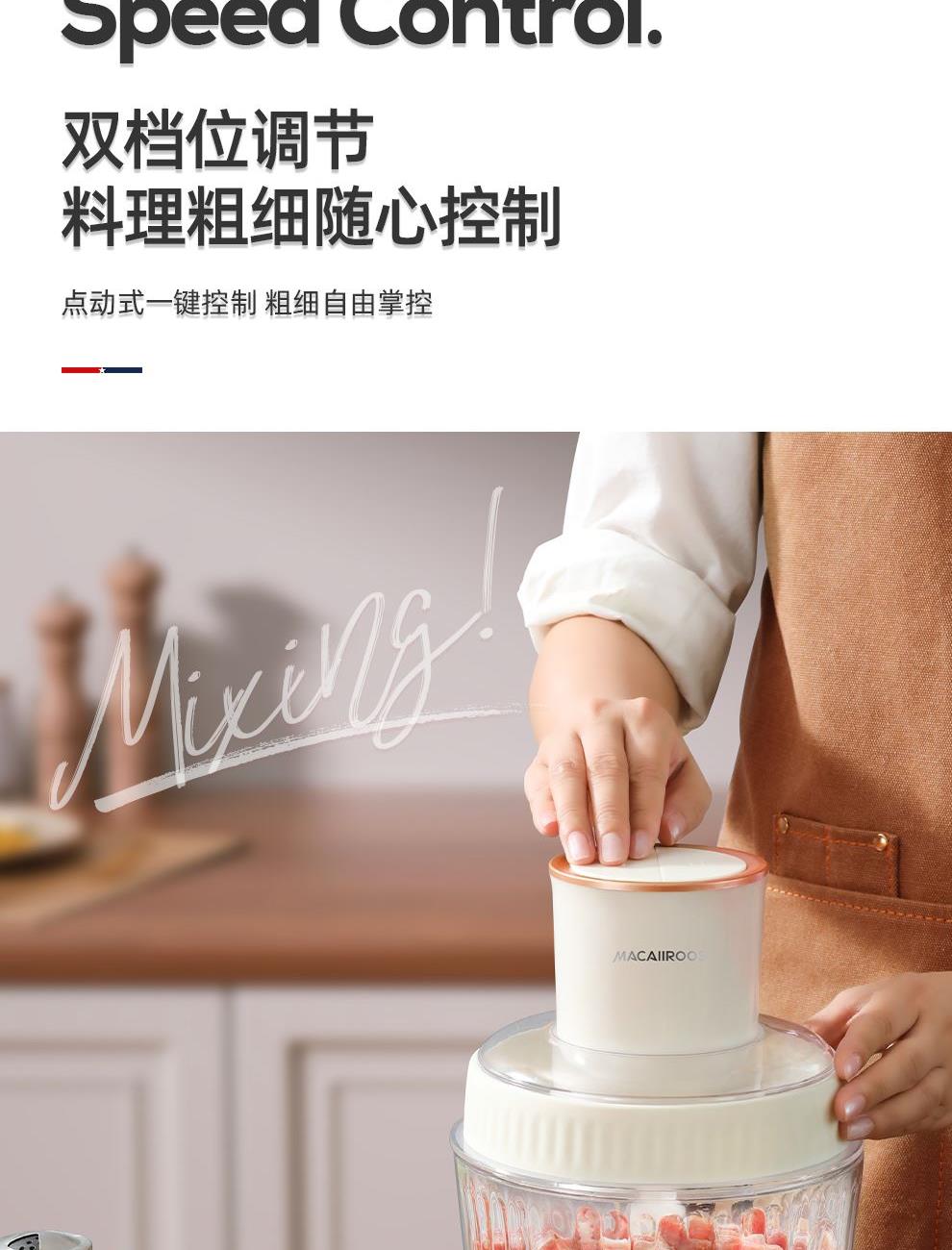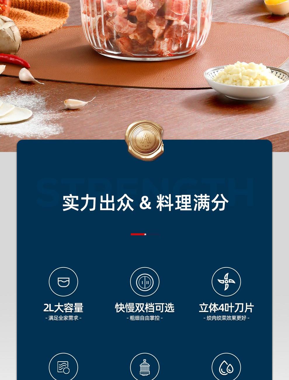 額定功率:300W 額定容量:2.0L 額定電壓:220V~ 額定頻率:50Hz 產(chǎn)品凈重:1.9kg 產(chǎn)品毛重:2.1kg 整箱重量:20.3kg 一機(jī)多用高硼硅玻璃攪拌杯,透明可視上蓋,絞肉、絞菜粗細(xì)易控; 快慢兩檔切換點(diǎn)動(dòng)控制,切碎隨意控制,抬手即停; 高速電機(jī)300W大功率高速電機(jī),細(xì)膩攪拌,秒速肉餡; 不銹鋼刀頭&安全無憂S型雙層、四葉精鋼分離式刀頭;