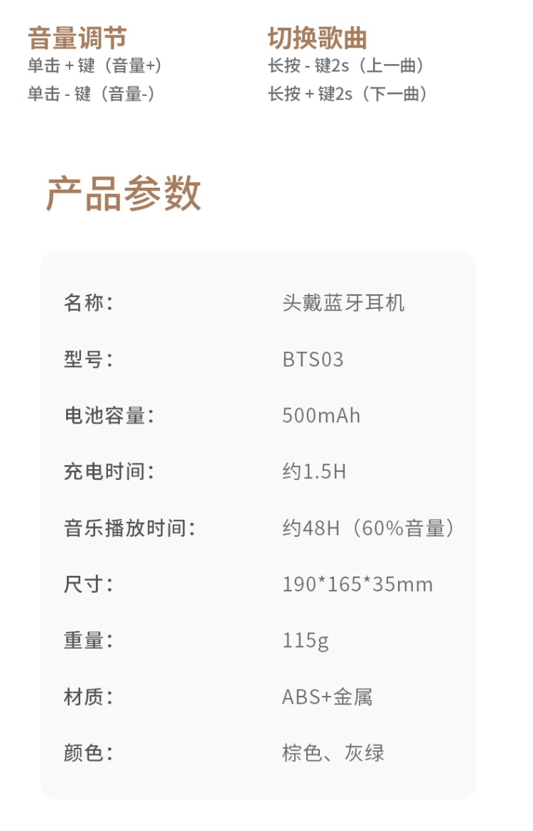 音樂(lè)通話(huà)時(shí)間:約48H(60%音量)顏色:棕色/灰綠